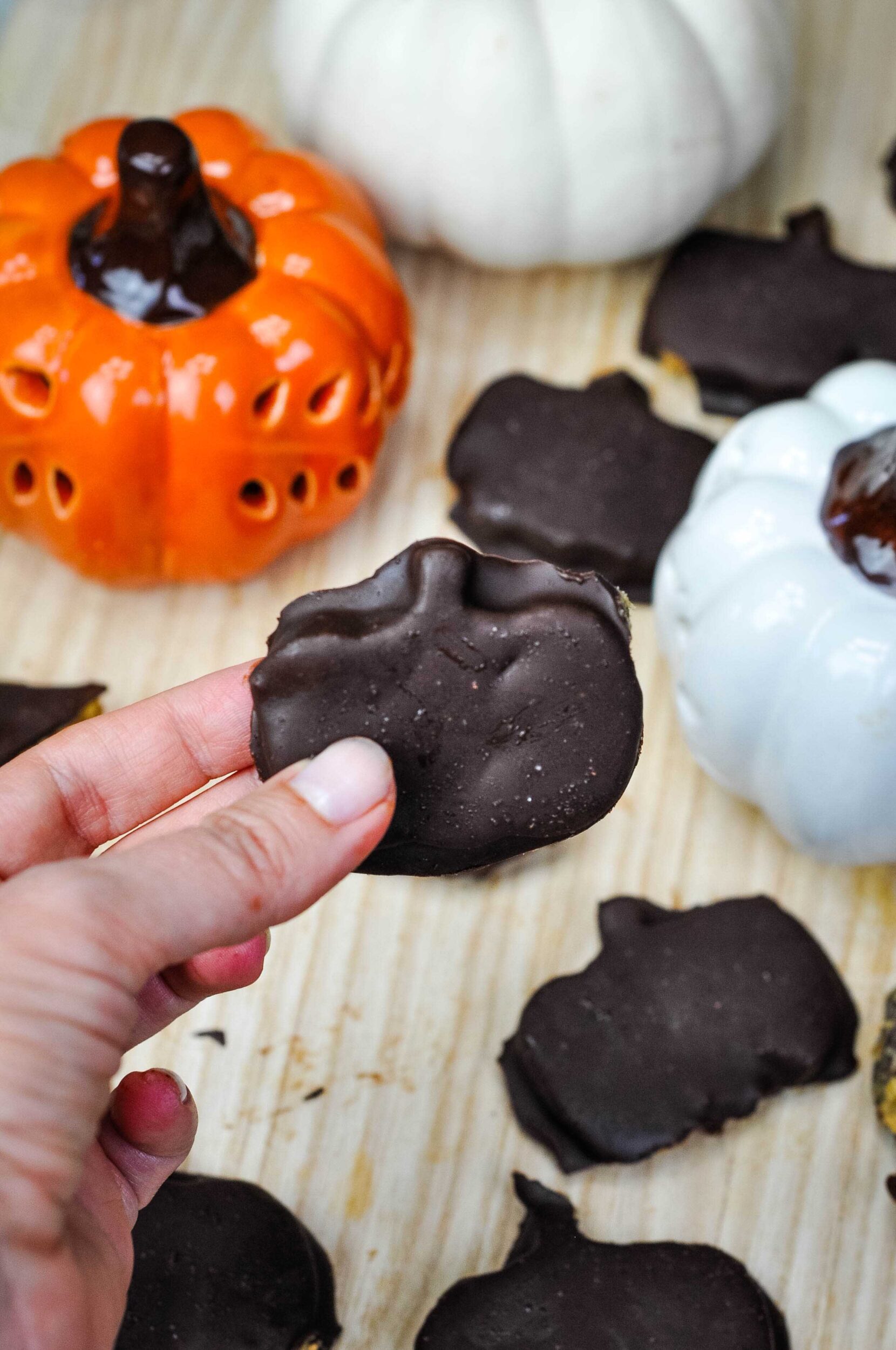 5. Dip each pumpkin into the chocolate coating with a fork and let the excess drip down, then place each pumpkin on a parchment lined plate. If desired, top with a sprinkle of salt.